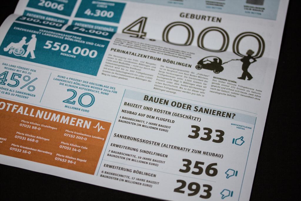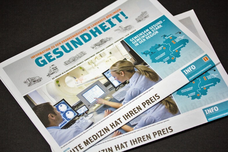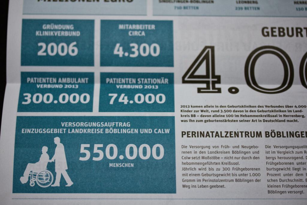 Die Postwurfsendung informiert über den Klinikverbund der Krankenhäuser Sindelfingen, Böblingen, Leonberg, Herrenberg, Calw und Nagold und den eventuellen Neubau eines Flugfeldklinikums. (Auflage: 195.00 Stück).