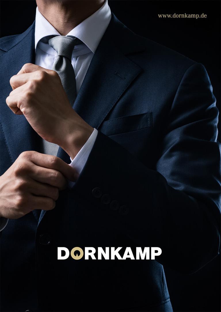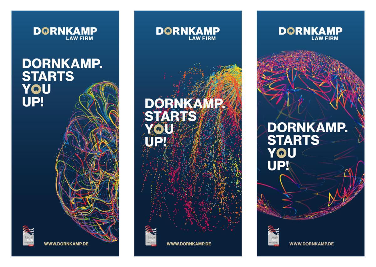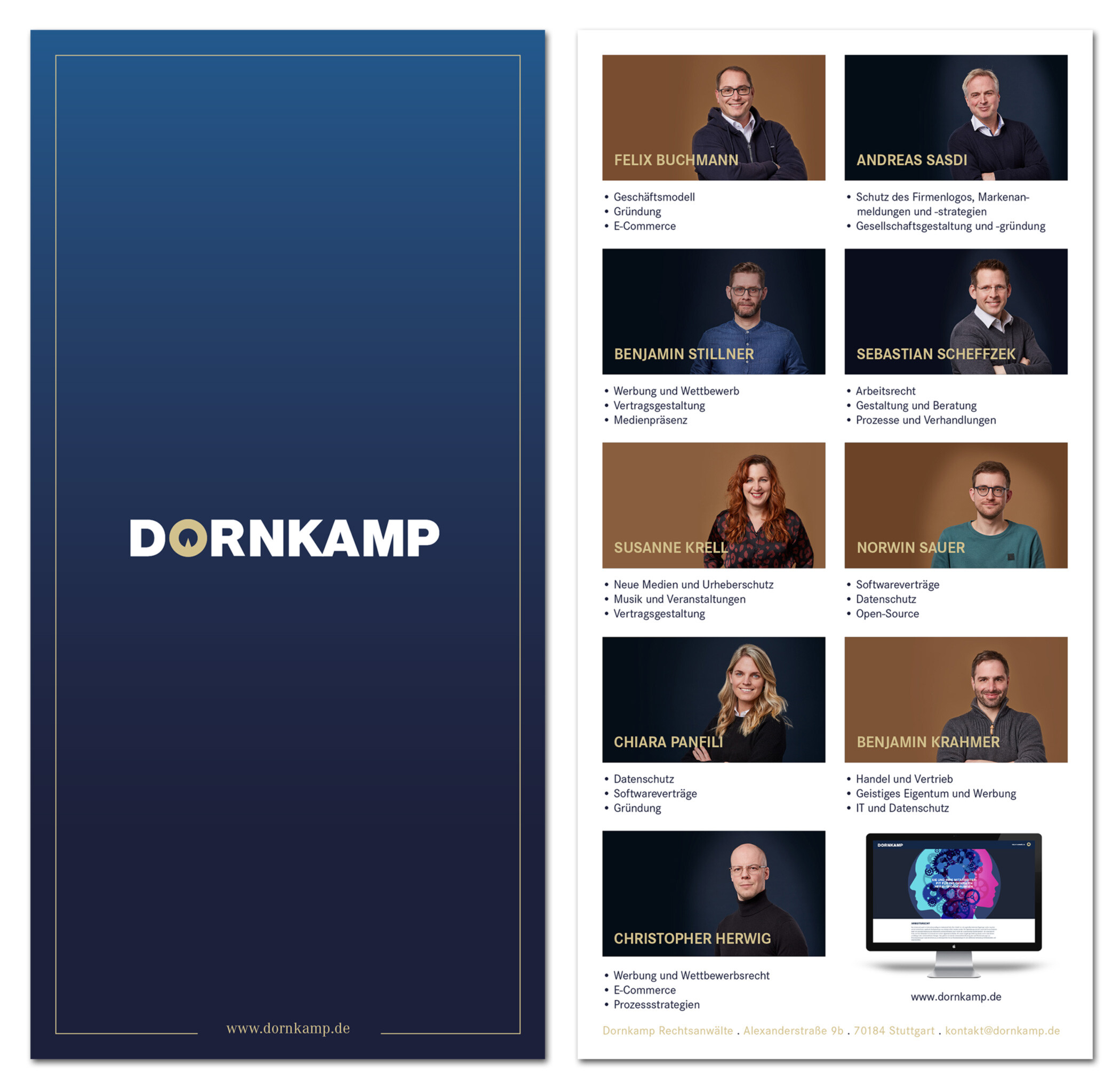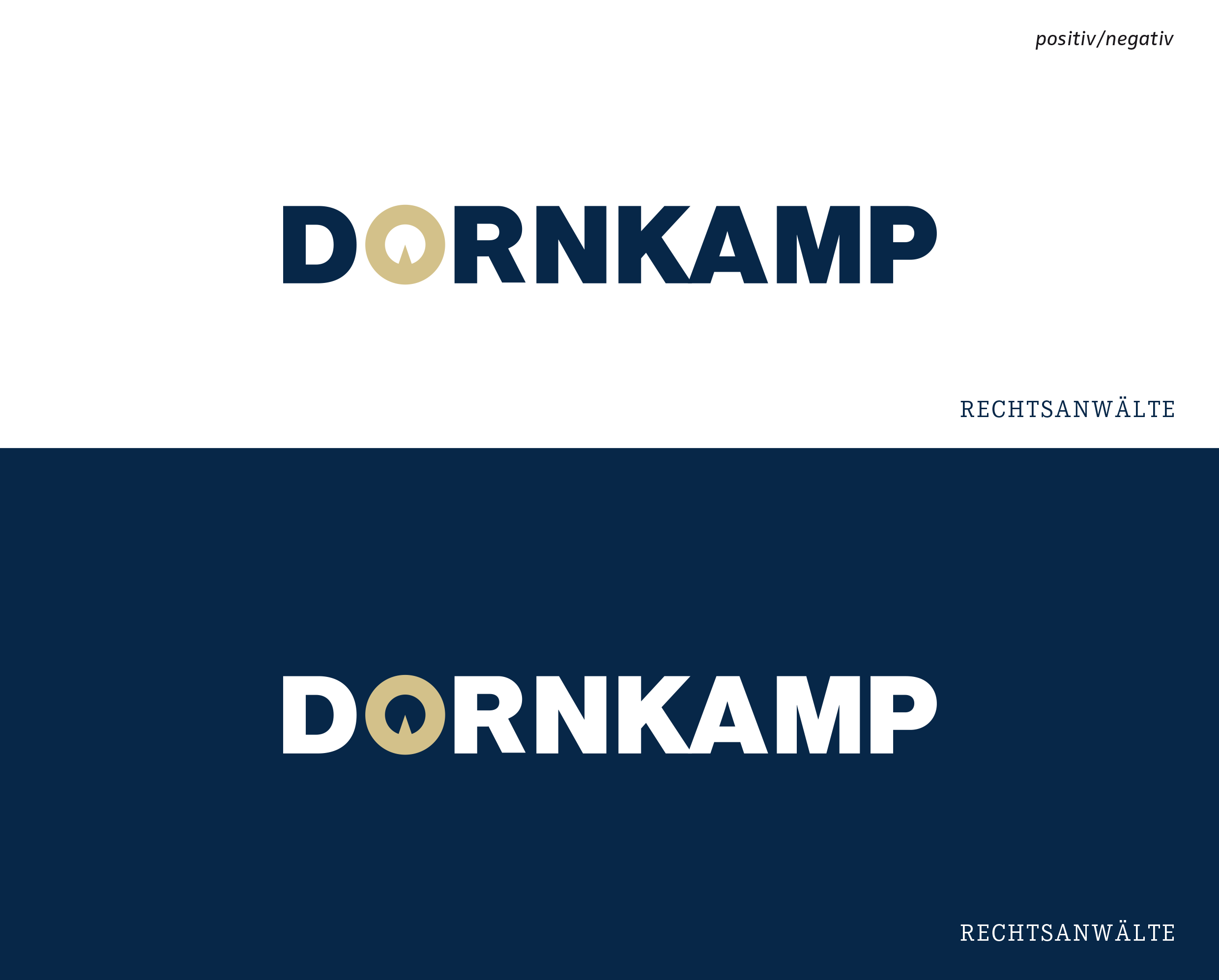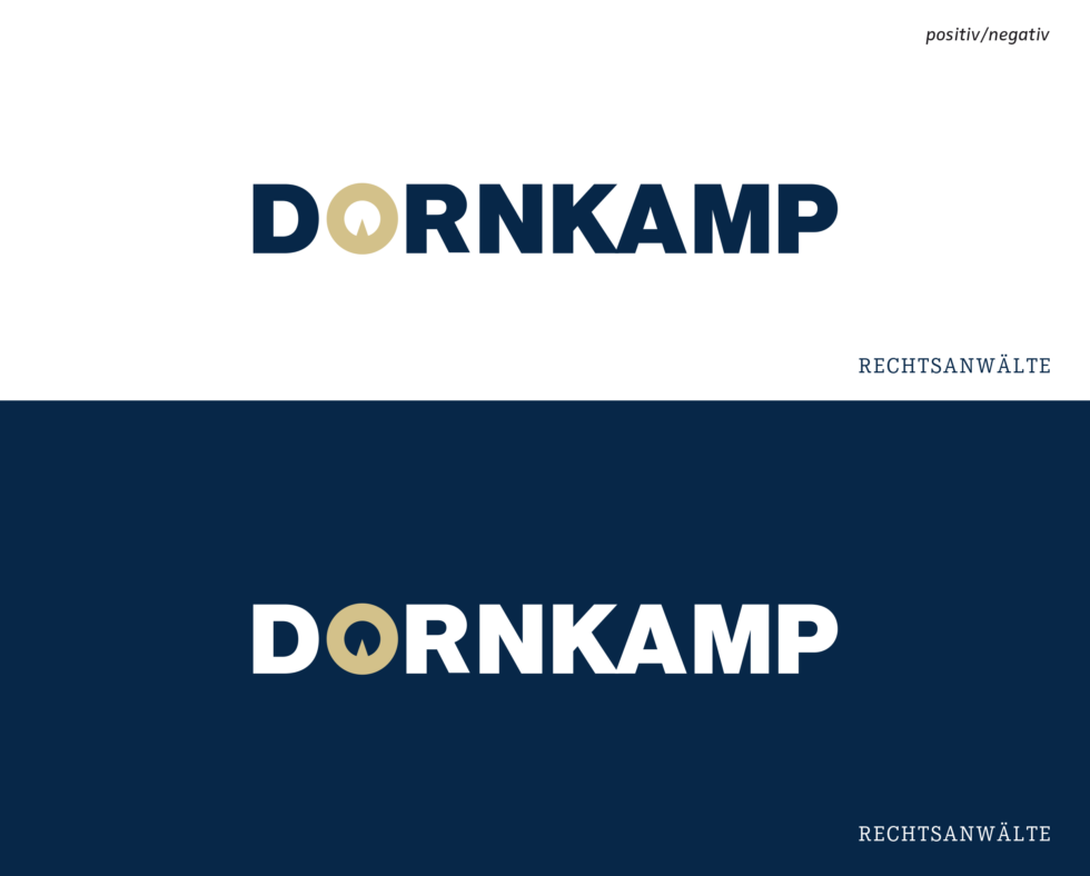 Namensfindung und Logo: Teil des Konzepts ist eine bewusste Abgrenzung von traditionellen Anwaltskanzleien. Statt den oder die Namen der »Senior Partner« im Logo und in der Wortmarke aufzuführen, steht der Name »Dornkamp« für eine fiktive Person, welche bewusst nicht als einzelner Partner in der Kanzlei auftaucht. Vielmehr spiegelt der Name »Dornkamp« eine Haltung wider, eine Philosophie der flachen Hirarchie und damit der Wertschätzung jedes einzelnen Anwalts in der Kanzlei.