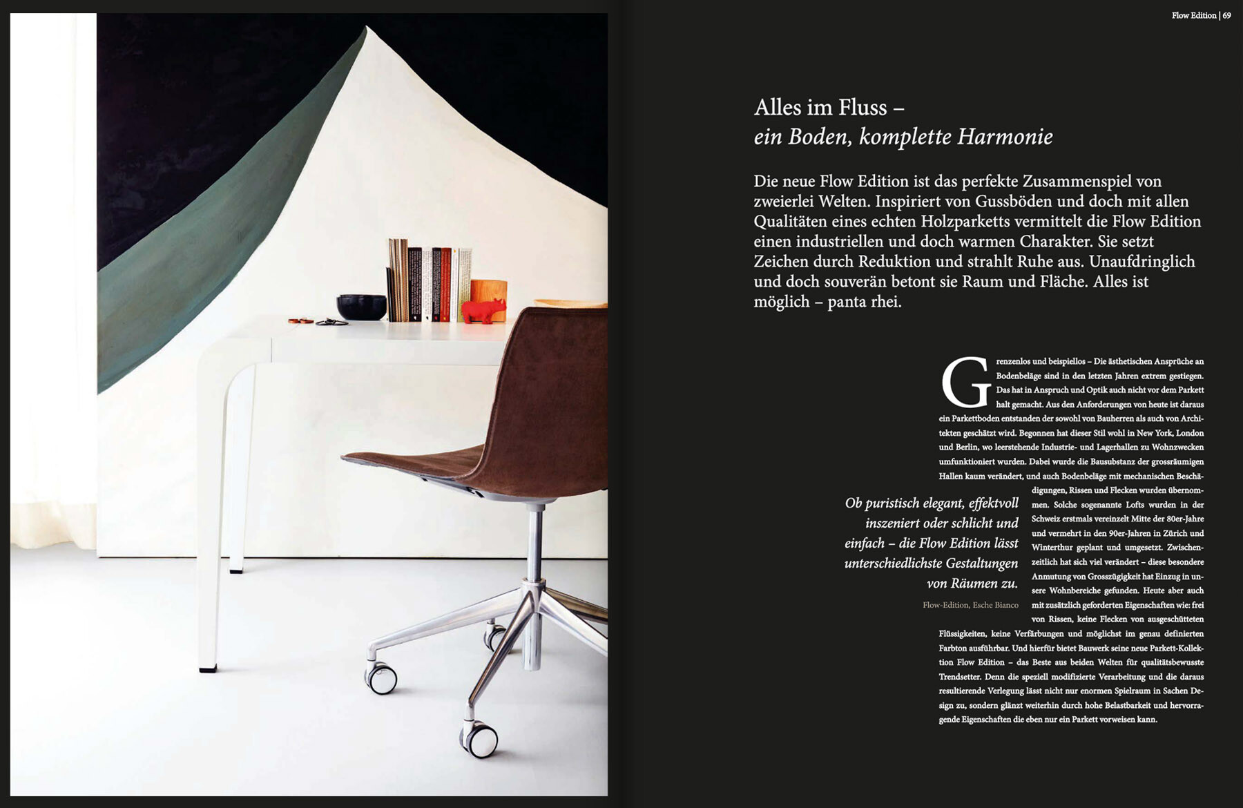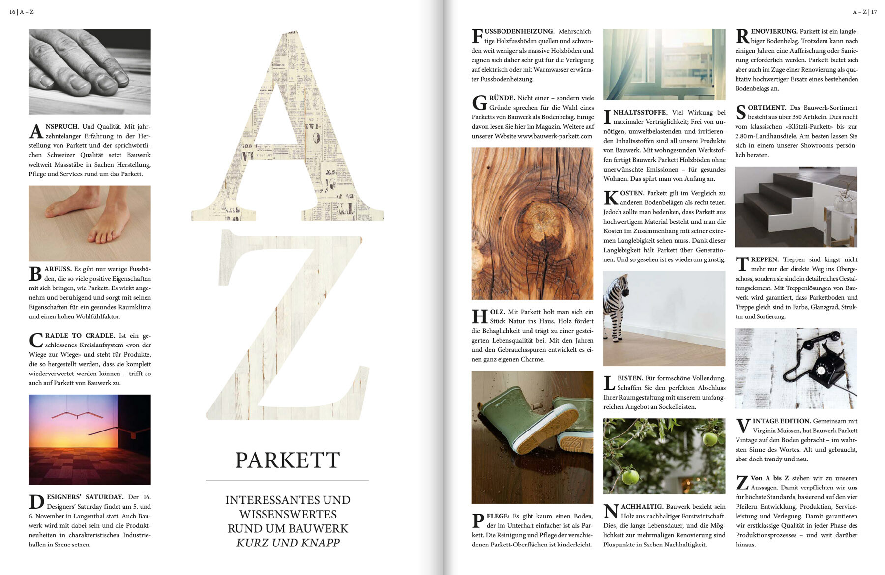 »Lebenswerk« ist das Magazin des Schweizer Parkettherstellers Bauwerk Parkett. Ästhetik, Stil, inspirative Wohnwelten und echte Schweizer Werte werden in großzügigen Fotostrecken vorgestellt. Fundiert recherchiert und charmant umgesetzt.
