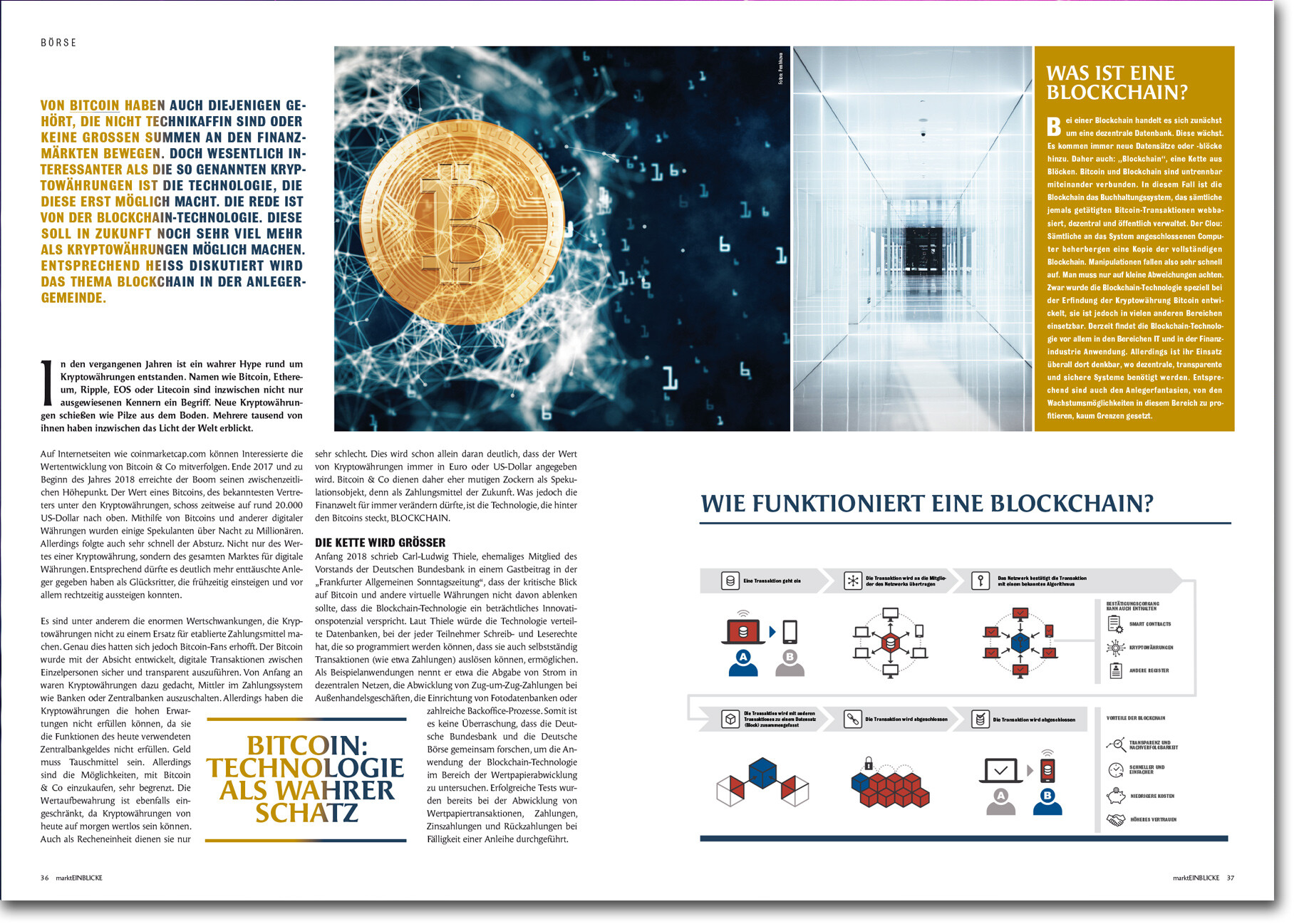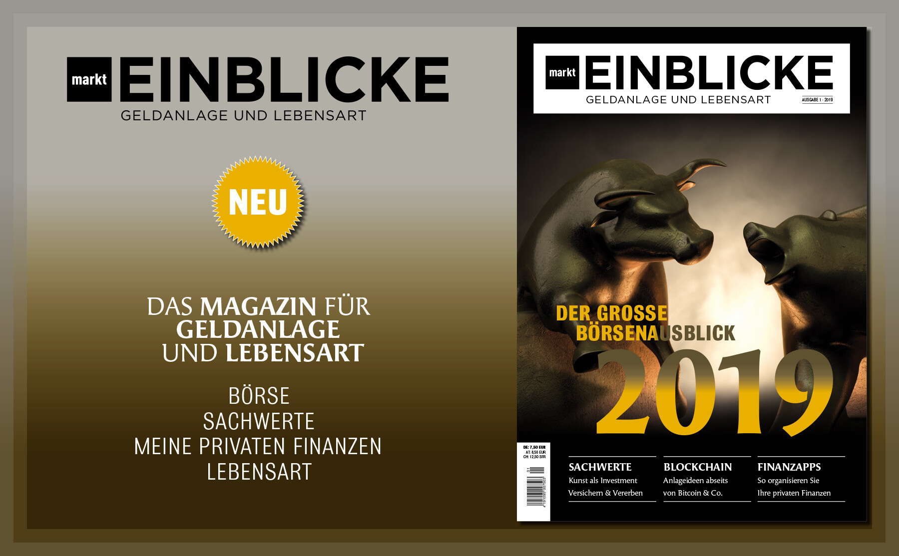 marktEINBLICKE – Das Magazin für Geldanlage und Lebensart. Ausgabe 01/2019 ab Dezember 2018 am Kiosk mit diesen Themen: Kunst als Investment, Blockchain und Finanzapps . 116 Seiten Geldanlage und Lebensart im Layout von Minister von Hammerstein und in redaktioneller Zusammenarbeit mit unseren Freunden von markteinblicke.de!