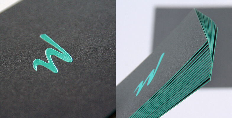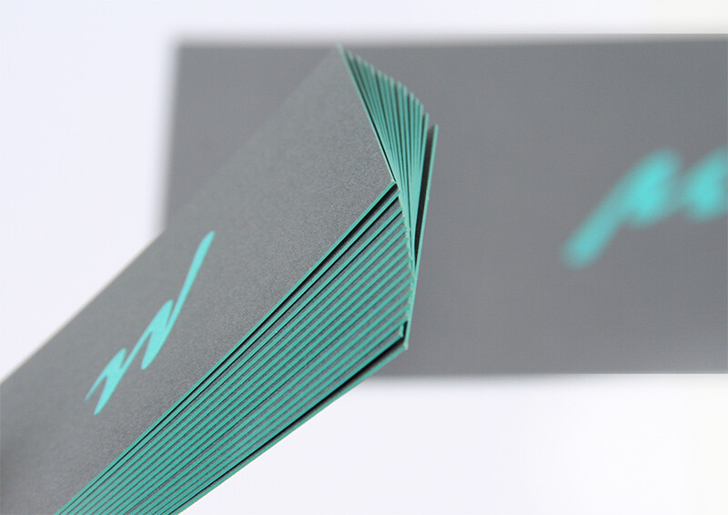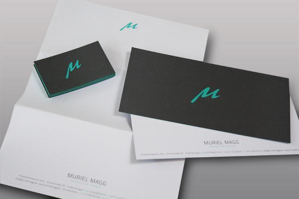 Erwähnenswert dabei sind die hochwertigen Veredelungen auf den Druckerzeugnissen. Angefangen mit der Auswahl eines sehr schönen Papieres für das Briefgut (»Fedrigoni Freelife Vellum« in hochweiß), einer Heißfolienprägung auf dem Briefpapier und der UV-Lackierung des Logos auf den Visitenkarten, bis hin zum außergewöhnlichen Farbschnitt in der Hausfarbe der Kundin, welcher den Karten einen zusätzlichen Akzent vermittelt.