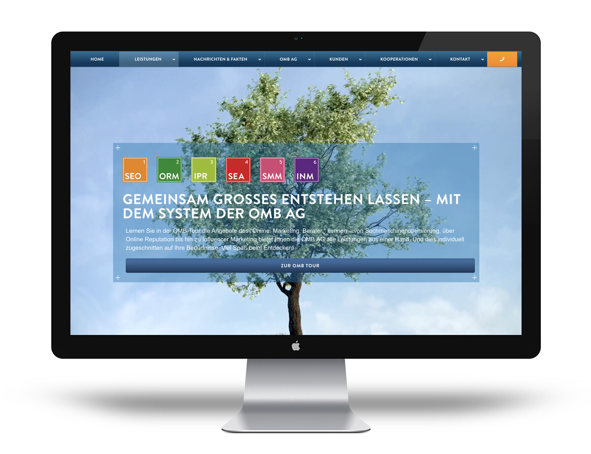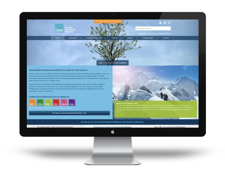 Nach dem erfolgreichen Logo- und Corporate Design-Relaunch vor einigen Jahren folgt nun auch ein neuer Webauftritt für die »OMB AG«. Das Unternehmen mit Sitz in Berlin, Frankfurt, Dortmund und Würzburg bietet »Online Marketing«, klassische Suchmaschinenoptimierung (SEO), aber auch »Online PR« und »Influencer Marketing« an und zählt mit tausenden erfolgreichen »Online Marketing«-Projekten zu den großen SEO-Playern in diesem Bereich.