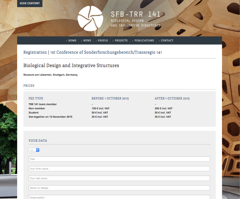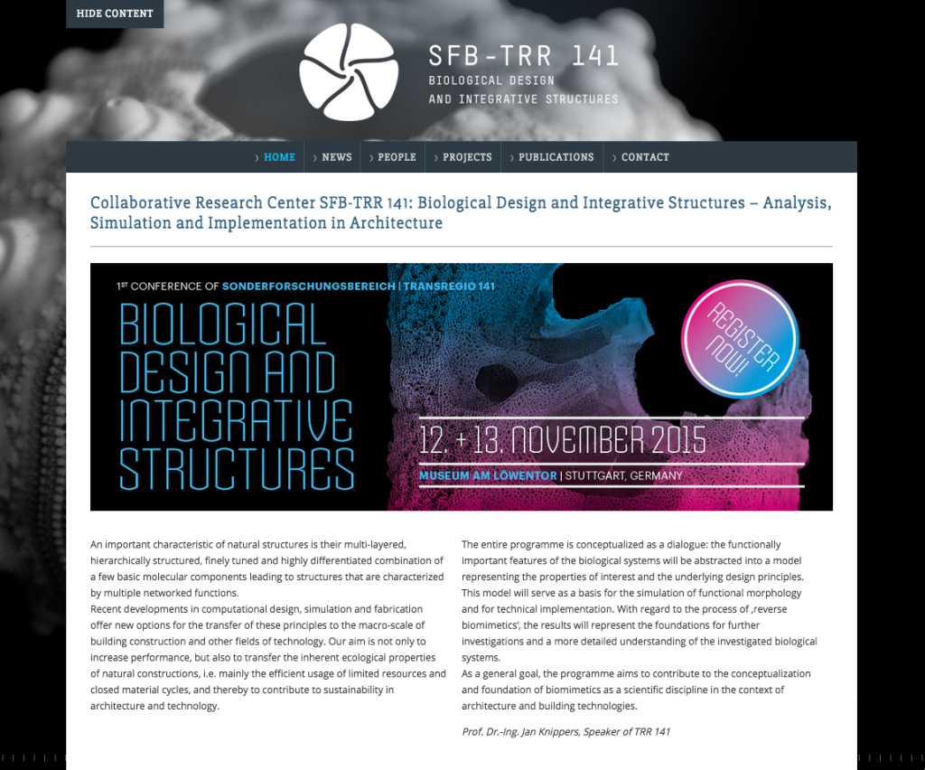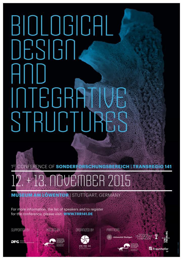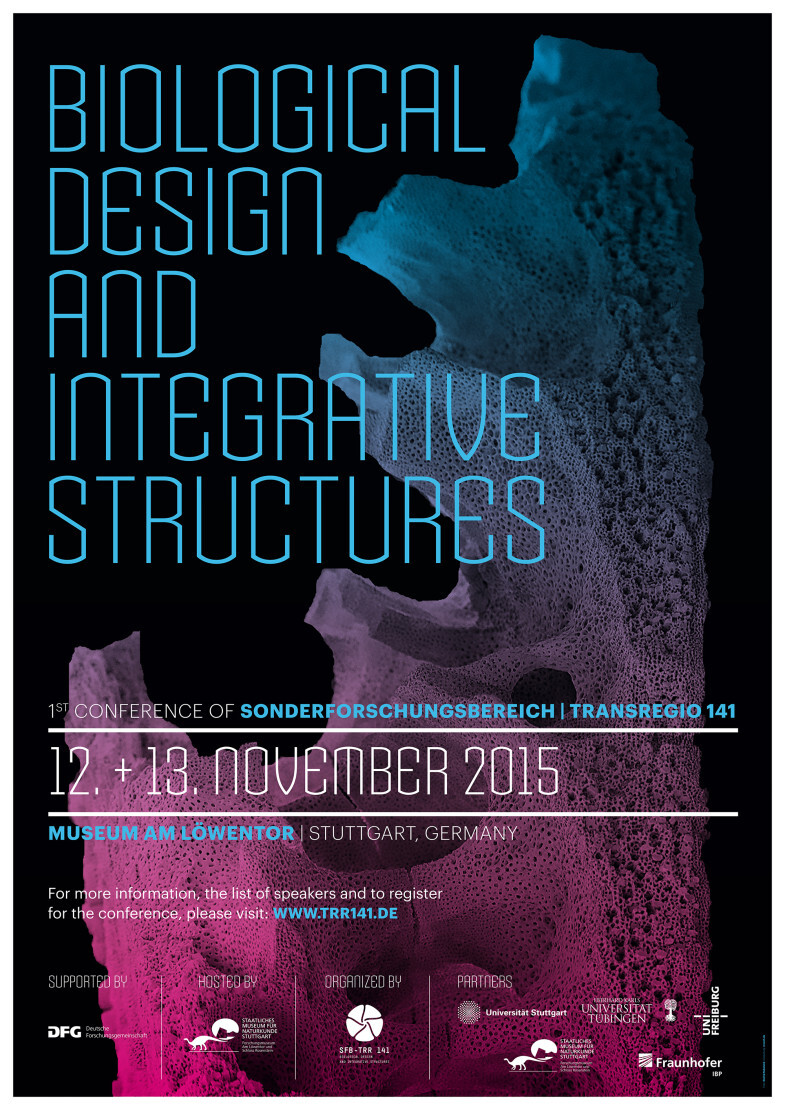 Plakat und Kommmunikationsmittel für die 1st Conference of Sonderforschungsbereich / Transregio 14. Collaborative Research Center SFB-TRR 141: Biological Design and Integrative Structures – Analysis, Simulation and Implementation in Architecture.