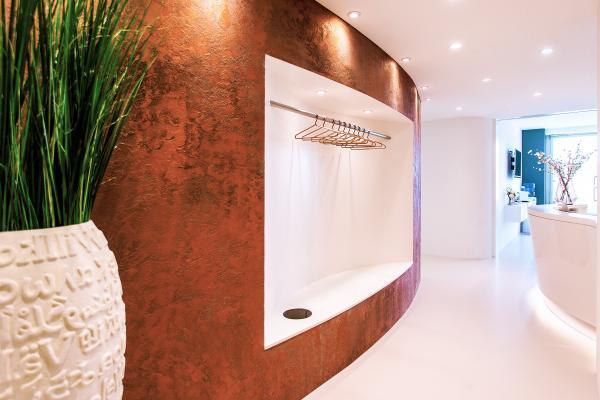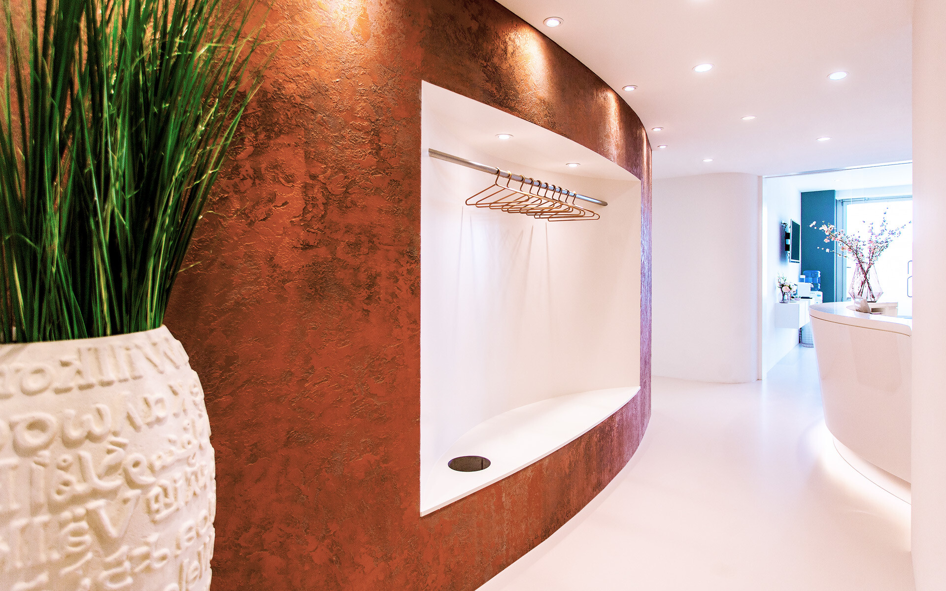 Wir setzten in der Kommunikation auf einen Mix von erdigen kupfer-bronze Farben und ruhigen Pastelltönen, die auch Eingang in das innenarchitektonische Konzept fanden. Modern, weiblich, warm und geborgen ist das Credo. Neben dem Logo entwickelten wir sämtliche praxisbezogene Kommunikationsmittel und die Homepage.